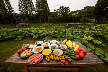 烏村恢復舊時農(nóng)家門前屋后有菜園的景象,大量的農(nóng)耕地種植了應時的農(nóng)作物,在午餐時可品嘗烏村特色“一小時蔬菜”,菜肴從采摘到上菜僅需1小時,新鮮到無可挑剔。游玩時垂釣所得的野生塘魚還可在烏村廚房進行烹飪。