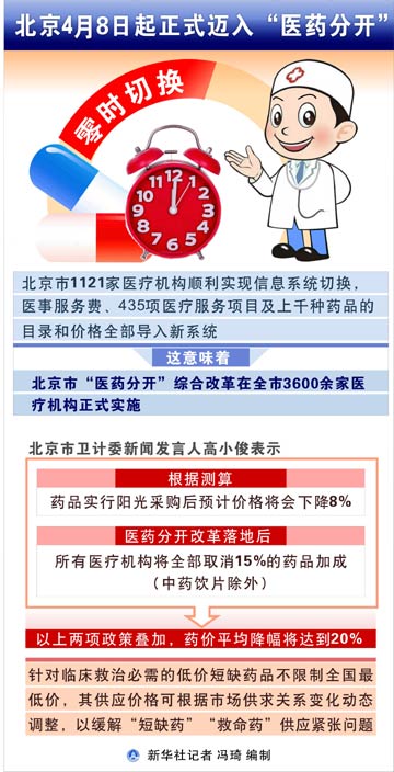 4月8日起,北京市實(shí)施了以取消藥品加成、設(shè)立醫(yī)事服務(wù)費(fèi)、調(diào)整醫(yī)療服務(wù)價格等為主要內(nèi)容的醫(yī)改措施。