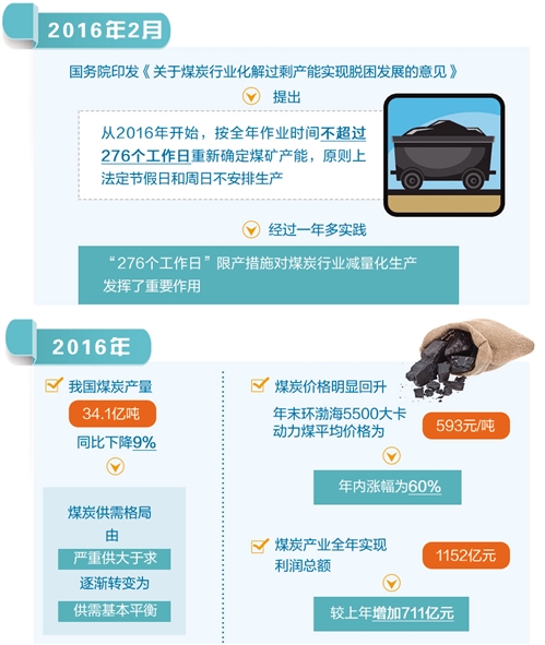 從實施效果看,這一措施達(dá)到了預(yù)期目標(biāo),使較長時間處于寒冬的煤炭產(chǎn)業(yè)經(jīng)濟(jì)形勢出現(xiàn)逆轉(zhuǎn)。2016年,我國煤炭產(chǎn)量34.1億噸,同比下降9%,煤炭供需格局由嚴(yán)重供大于求逐漸轉(zhuǎn)變?yōu)楣┬杌酒胶?煤炭價格明顯回升,年末環(huán)渤海5500大卡動力煤平均價格為593元/噸,年內(nèi)漲幅為60%;煤炭產(chǎn)業(yè)全年實現(xiàn)利潤總額1152億元,較上年增加711億元。