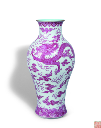 ??? 清乾隆 胭脂紅料蒼龍教子圖撇口瓶 |