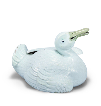 此外,唐英制像生瓷鴨在拍場(chǎng)最終以377.6萬(wàn)港幣成交。唐英在職時(shí),仿生瓷器達(dá)到陶瓷史上最高水平。瓷鴨臥式,造型寫(xiě)實(shí),全身絨毛均細(xì)致刻畫(huà),工藝極為細(xì)膩,體現(xiàn)出唐英制器的超高工藝水平和藝術(shù)水平。