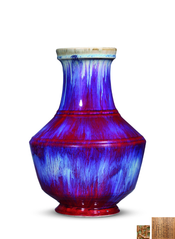 來(lái)源于久原躬弦舊藏的“清雍正·窯變釉盤(pán)口弦紋瓶”最終以383.5萬(wàn)港幣成交。窯變釉是雍正時(shí)唐英督理景德鎮(zhèn)御窯廠時(shí)仿鈞窯釉色所繁衍出的一個(gè)創(chuàng)新品種,此件作品即為以窯變之釉色燒制當(dāng)朝創(chuàng)新之器型,紅紫交融,合于天造,厭于人意。