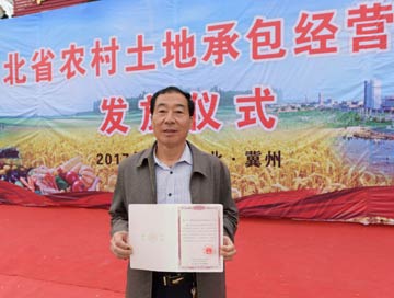 圖為衡水市冀州區(qū)莊子頭村村民魏九明在展示領(lǐng)到的《農(nóng)村土地承包經(jīng)營權(quán)證》。新華社記者 王曉/攝?
