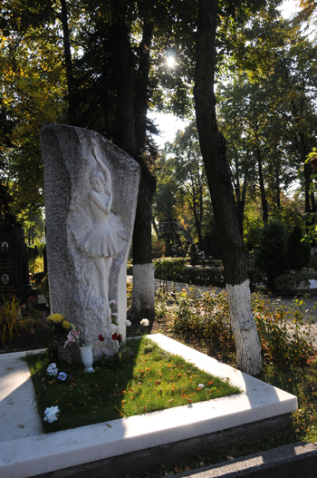 芭蕾舞藝術(shù)家烏蘭諾娃的墓碑則是由一塊通體白色大理石雕刻而成,正面有一個(gè)跳芭蕾舞的人形浮雕。只見(jiàn)舞者足尖輕輕點(diǎn)地,四肢柔韌靈動(dòng),恍惚間,這只美麗的“白天鵝”似乎從未離去,她只不過(guò)是去了一個(gè)更美的舞臺(tái),在那里繼續(xù)向人們展示真正的美。
