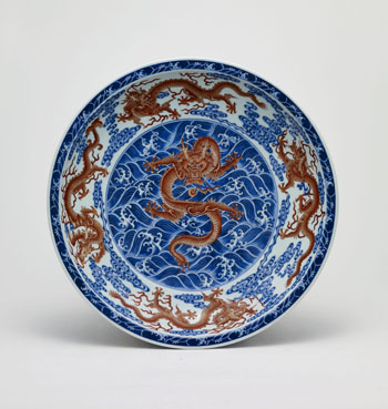 具體來(lái)看,清雍正青花礬紅“水波云龍”紋折沿大盤,款識(shí)為“大清雍正年制”六字雙行楷書款,該品形制恢宏,釉汁瑩潤(rùn)如玉。盤心繪海水立龍捧珠圖,氣勢(shì)凌人,躍然眼前。內(nèi)外壁分繪三條行龍和一條翼龍,或回首、或前行,龍爪有三爪、五爪之別,龍尾有花尾、尖尾之分。以礬紅裝飾龍紋,色澤鮮妍厚潤(rùn),色階過(guò)渡自然,騰龍矯健有神,氣勢(shì)非凡。祥云迤邐,浪濤卷卷,更見(jiàn)映襯九龍之動(dòng)感無(wú)比鮮明。海水云龍,二者連接處過(guò)渡自然,融為一體,使人不得不贊嘆畫師技藝之精湛,彰顯雍正時(shí)期宮廷藝術(shù)的無(wú)比嚴(yán)謹(jǐn)和精致。