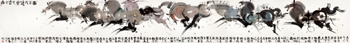 《八駿行云追風(fēng)圖》中,韓美林取意隋唐詩(shī)人李賀的幾首馬詩(shī)。八首馬詩(shī)對(duì)應(yīng)八匹奔騰的駿馬,每一匹良駒配一首詠嘆和歌頌。原作畫面氣勢(shì)恢弘,似有身臨其境,感受萬馬奔騰的嘶叫和震耳欲聾的馬蹄聲從身邊呼嘯而過的既視感。畫面的帶入感很強(qiáng),像是一種情感的壓迫,又像是一場(chǎng)挑戰(zhàn)你所有感官的視覺盛宴。唐人李賀的《馬詩(shī)》是通過詠馬、贊馬或慨嘆馬的命運(yùn),來表現(xiàn)志士的奇才異質(zhì)、遠(yuǎn)大抱負(fù)及不遇于時(shí)的感慨與憤懣。而韓美林通過對(duì)馬詩(shī)的引用,更多的是借用詠馬的意境和情懷,讓人們?nèi)ジ惺軐?duì)《馬》生命不息的感慨和對(duì)《馬》自在狂野、自由奔放狀態(tài)的美好期盼和愿望。
