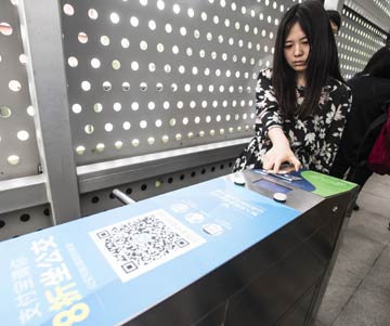 6月14日,乘客在武漢BRT武昌火車站刷支付寶進(jìn)站乘車。螞蟻金服數(shù)據(jù)顯示,武漢城區(qū)98%的出租車、超過80%的超市便利店、超過75%的餐飲門店、休閑娛樂等行業(yè)均支持移動(dòng)支付。去年武漢市共有超過100萬人次,使用支付寶在醫(yī)院掛號(hào)、就診。?記者 肖藝九/攝 |