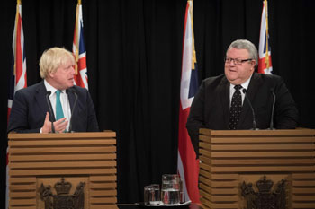??? 7月25日,在新西蘭惠靈頓,英國外交大臣鮑里斯·約翰遜(左)出席與新西蘭外交部長格里·布朗利共同舉行的新聞發(fā)布會。到訪新西蘭的約翰遜25日在惠靈頓表示,在英國退出歐盟后談判自由貿(mào)易協(xié)定的對象中,新西蘭“排在前列”。新華社/法新 |