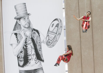 ??? 7月23日,在加拿大溫哥華,舞者們在溫哥華圖書館大樓外墻進(jìn)行空中舞表演。當(dāng)日,溫哥華Aeriosa舞蹈團(tuán)在溫哥華圖書館大樓進(jìn)行空中舞表演。舞者們被繩索懸掛在五層高的大樓上,把大樓外墻變成舞臺,隨著音樂展現(xiàn)優(yōu)美的舞姿。新華社發(fā)(梁森 攝) |