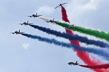 ??? 7月23日,在俄羅斯莫斯科郊外的茹科夫斯基市,阿聯(lián)酋空軍“騎士”飛行表演隊(duì)在莫斯科航展上進(jìn)行飛行表演?!‘?dāng)日,莫斯科國際航空航天展覽會閉幕。新華社/衛(wèi)星社 |