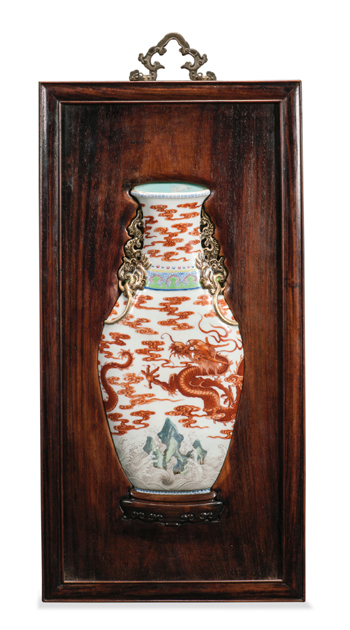 另一件礬紅洋彩龍紋壁瓶則是專門為壁面裝飾制作的。瓶身扁平,不能容物,但通過巧妙的裝飾設(shè)計(jì),使之極富立體感,瓶身圖樣皆略微屈曲變形,瓶頸處的如意云紋尤其明顯;瓶口的制作巧妙利用了透視法;兩側(cè)以浮雕和鏤雕技法作兩枚精細(xì)古雅的鋪首銜環(huán),又涂以金彩,裝飾效果極佳,在視覺上也頗有迷惑性,望去真如一瓶。掛于壁上之時,如寶瓶懸空,亦真亦假,可謂有十分匠心奇趣。此瓶釉色也十分優(yōu)美珍罕,瓶身云龍紋用礬紅繪成,發(fā)色明艷純正如朱砂,且深淺濃淡變化多端,令人有“朱分五色”之感,五爪神龍飛騰于天際,須爪張揚(yáng),昂首吞吐云氣,神姿矯健氣勢撼人,極具天家風(fēng)范,鱗片、須爪纖毫畢現(xiàn),且陰陽向背、質(zhì)感動態(tài)皆分明可觀,繪者功力不俗。近底足處用洋彩繪江崖海水,筆觸細(xì)膩,呈色柔麗。碧海之中驚濤駭浪,中央山崖聳立,青綠嶙峋,一動一靜之間,海浪撲打飛珠濺玉之情態(tài)、山崖高屹巋然不動之氣派,皆呼之欲出,令人觀之若有風(fēng)聲在耳,海霧撲面。瓶頸處飾以洋彩如意云頭紋,又點(diǎn)綴一圈紅藍(lán)連珠,如美人頸上帶瓔珞,更添風(fēng)姿,設(shè)色清麗柔和,與底部的洋彩江崖海水遙相呼應(yīng),也使整器之配色更加和諧。