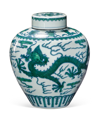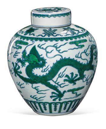 以龍紋為主要紋飾的藝術(shù)作品很早便出現(xiàn),直到明清時期達(dá)到巔峰。瓷器、玉器、金銀器、漆器等等,往往被自命為“真龍?zhí)熳印钡牡弁跛姁邸2煌瑫r期的龍紋具有不同的藝術(shù)風(fēng)格,而“龍紋”的風(fēng)格往往與當(dāng)時的時代氣息相當(dāng)吻合。以明代為例,永宣時期為明朝國力最昌盛的時期,社會生產(chǎn)力得到極大發(fā)展,體現(xiàn)在龍的形態(tài)與表情上就形成威猛神氣的姿態(tài)。而發(fā)展到明中期成化弘治年間,社會穩(wěn)定而發(fā)展乏力,人們更愿意享受富貴生活而不是不斷開疆拓土,同時期龍紋就顯得規(guī)矩有余而霸氣不足。再到明晚期的嘉萬年間,各種社會問題逐漸顯現(xiàn),皇帝甚至出現(xiàn)不理朝政的現(xiàn)象,龍紋畫片也就變得如皮影畫一樣民俗風(fēng)味十足。由此可見,社會氣質(zhì)的變遷會影響藝術(shù)家與工匠們的審美意識形態(tài),從而直接體現(xiàn)在藝術(shù)風(fēng)格的轉(zhuǎn)變上,同樣的道理如輪回般再次出現(xiàn)在清代的藝術(shù)品領(lǐng)域,比如龍紋風(fēng)格的轉(zhuǎn)變上。從順治康熙時期龍紋的霸氣甚至狂放,到雍正乾隆時期的氣派而富有張力,到嘉慶道光時期的安詳而富貴,最后到晚清時期的作意甚至呆板。今年嘉德春拍宮廷拍賣中幾件明清時期的龍紋瓷器玉器是中國在最富足時期的藝術(shù)巔峰之作,通過它們可以窺見皇家藝術(shù)的精美與震撼。這個門類亦是當(dāng)下收藏界的熱門板塊。本版精選了今年春拍的幾件作品供讀者賞析。