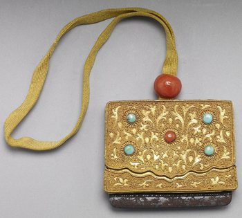臺(tái)北故宮博物院藏 清 鍍金嵌松石珊瑚火鐮盒 長6.5cm |