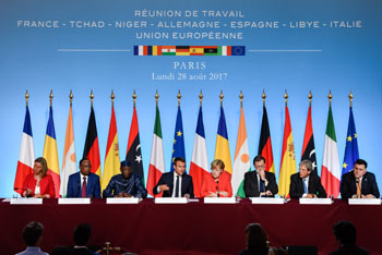 ??? 法國、德國、西班牙、意大利、利比亞、尼日爾、乍得等7國領導人以及歐盟外交與安全政策高級代表8月28日在巴黎舉行會晤并發(fā)表共同聲明說,相關各方就應對非法移民問題達成多項共識。記者 陳益宸 攝 |
