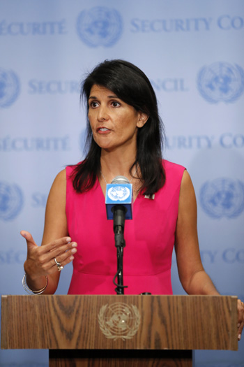 ??? 8月25日,在位于紐約的聯(lián)合國總部,美國常駐聯(lián)合國代表妮基·黑莉向媒體發(fā)表講話。黑莉說,國際原子能機構應“傾盡其職權”對伊朗核設施進行檢查,并表達美國對這一進程的支持。記者 李木子 攝 |