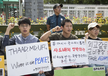 ??? 8月29日,在韓國首爾,民眾手舉反對部署“薩德”的標語抗議示威。韓國民眾29日在位于首爾的韓國國防部前舉行反對部署“薩德”系統(tǒng)的集會。新華社發(fā)(李相浩 攝) |