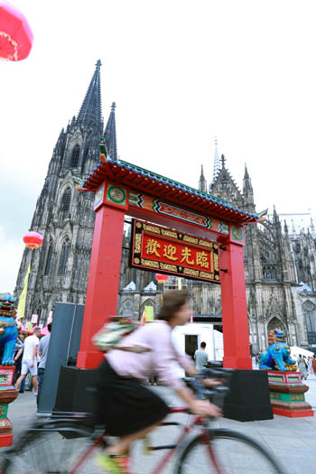 ??? 8月26日,人們在德國科隆大教堂前舉辦的中國節(jié)上游覽。第三屆科隆中國節(jié)于8月25日至27日在科隆大教堂廣場舉行。北京老字號特色商品展賣、老字號傳統(tǒng)技藝現(xiàn)場展演、“魅力北京”旅游圖片展等活動讓德國民眾與中國文化進行了一次親密接觸。記者 羅歡歡 攝 |