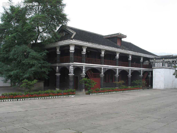 旅行者一般來此,都想到紅色圣地轉(zhuǎn)轉(zhuǎn),看看遵義會(huì)議召開的地方。遵義會(huì)議會(huì)址原為黔軍25軍第二師師長柏輝章的私人官邸,修建于30年代初。整個(gè)建筑分主樓、跨院兩個(gè)部分。主樓為中西合璧,臨街有八間鋪面房。鋪面居中有一小牌樓,檐下懸掛著毛澤東1964年11月題寫的“遵義會(huì)議會(huì)址”六個(gè)字的黑漆金匾。街面房連接主樓與跨院之間有一座青磚牌坊。牌坊上方用碎藍(lán)瓷鑲嵌著“慰廬”二字。牌坊的另一面有“慎篤”二字,遵義會(huì)議會(huì)址主樓坐北朝南,一樓一底,為曲尺形,磚木結(jié)構(gòu),歇山式屋頂,上蓋小青瓦。樓房有抱廈一圈,樓頂有一老虎窗。樓層有走廊上,可以憑眺四圍蒼翠挺拔的群山,指點(diǎn)昔日紅軍二占遵義時(shí)與敵軍鏖戰(zhàn)地紅花崗,插旗山、玉屏山、鳳凰山諸峰。會(huì)址主樓上下的門窗,漆板栗色,所有窗牖均鑲嵌彩色玻璃。緊挨主樓的跨院純?yōu)槟窘Y(jié)構(gòu)四合院,仍漆板栗色。