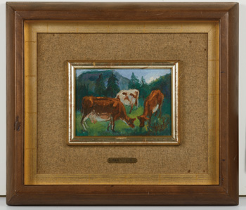創(chuàng)作《山中群牛》此作時(shí),當(dāng)時(shí)的巴黎正被德軍占領(lǐng),市區(qū)淪陷,情勢(shì)緊張,潘玉良避居郊區(qū),看到在林中覓食的牛群,想起了在國(guó)內(nèi)的親人,當(dāng)時(shí)她經(jīng)濟(jì)狀況拮據(jù),以小尺幅的畫板,畫下此作,尺寸雖小,但方寸之間見(jiàn)其對(duì)空間的經(jīng)營(yíng)與主體的描繪毫不馬虎。畫幅中前中后三景分明,前景與中景處可見(jiàn)三只牛低頭吃草,兩大一小,其下筆老辣精準(zhǔn),在強(qiáng)而有力的撇捺轉(zhuǎn)折間,將動(dòng)物的飽滿強(qiáng)壯的身體結(jié)構(gòu)描繪出來(lái),透過(guò)些微色調(diào)的變化與提亮,標(biāo)示了光線的軌跡與牛只脊谷,當(dāng)中毫無(wú)贅筆。而牛群被山林環(huán)繞,仿佛無(wú)憂無(wú)慮,與世無(wú)爭(zhēng)。潘玉良借著畫筆,若在創(chuàng)作中與海外的家人團(tuán)聚,在這里沒(méi)有戰(zhàn)火,沒(méi)有流言,只存純粹的寧?kù)o,柔和自在,展現(xiàn)了她心靈中的桃花源,賦予了此作超越表象的深度內(nèi)涵,別具意義。