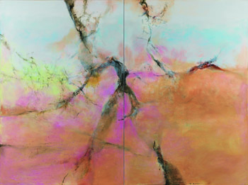 《24.12.2002-雙聯(lián)作》一股柔和而具有律動的能量充盈于此巨幅雙聯(lián)畫作,微妙的色彩層次的視覺感非常豐富:上方一抹湖藍色與下方的梅紅色以及大面積的暖褐色融合為背景色。這與趙無極早期作品著重用筆的力度及油彩的厚重方式不同,此作品不但探索了色彩,光線及用色的巧妙運用,更是散發(fā)出輕盈的氣息以及由畫布自內向外散發(fā)的柔和光芒。這種對于輕盈、抽象的空間的追尋,契合大膽的色彩運用正是趙無極在晚期創(chuàng)作所追尋的和諧點。趙無極的藝術成就不僅在于他在西方抽象藝術發(fā)展中開創(chuàng)了其獨特具有東方美學的藝術風格,更是他將中國哲學的深刻洞見與創(chuàng)造性詮釋于藝術創(chuàng)作之中,這條東西美學融合的艱難探索之路,不但在世界藝術史發(fā)展中留下精彩的篇章,亦是藝術家回歸內在本源。佳士得亞洲二十世紀及當代藝術資深專家莊俊表示:“作為世界藝術舞臺上最耀眼的華人藝術大師之一,趙無極豐富的繪畫語言與筆觸不斷帶給我們驚喜與感動。此件由歐洲征集的藝術家晚期代表作品更為本季秋拍增添更多色彩和分量。與此同時,本專題將呈現(xiàn)數(shù)件趙無極不同時期油畫和紙上等精甄之作?!?/p>