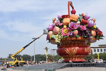 ??? 9月24日,工人在布置天安門廣場“祝福祖國”巨型花籃。當(dāng)日,天安門廣場“祝福祖國”巨型花籃基本布置完畢。今年的大花籃以喜慶的“花果籃”為主景,籃內(nèi)擺放柿子、石榴、蘋果及牡丹、玉蘭、月季等仿真花果,寓意十八大以來我國在各領(lǐng)域取得的輝煌成就。大花籃頂高17米、籃體高15.3米,底部花壇采用心形圖案,直徑達(dá)50米。籃體南側(cè)有“祝福祖國,1949-2017”、北側(cè)有“喜迎十九大”字樣。從2011年開始,“祝福祖國”巨型花籃就一直作為廣場中心花壇,在國慶節(jié)期間向祖國獻(xiàn)禮。記者 羅曉光 攝 |
