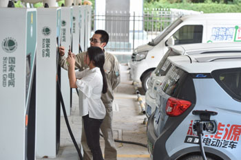 ??? 9月27日,在福建省南安市一處國家電網(wǎng)電動汽車充電站,市民(前)向技術(shù)人員了解充電操作流程。國慶將至,電動汽車租賃市場升溫,不少租車公司、共享汽車企業(yè)紛紛推出針對電動汽車用戶的出行套餐。記者 宋為偉 攝 |