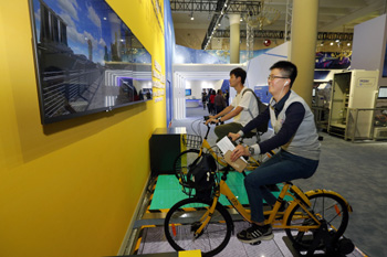 ??? 9月26日,參觀者在體驗共享單車互動騎行。當(dāng)日,在北京展覽館舉行的“砥礪奮進(jìn)的五年”大型成就展正式面向公眾開放,展覽中的多種互動體驗式展區(qū)、展品吸引眾多參觀者參觀。記者 沈伯韓 攝 |