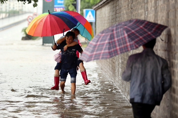 ??? 9月25日,在江蘇省常州市街頭,行人走過積水路段。當(dāng)日上午,江蘇省氣象臺發(fā)布暴雨橙色預(yù)警信號,南京中北部、淮安南部、常州、鎮(zhèn)江、無錫等地出現(xiàn)連續(xù)3小時50毫米降水,交通出行受到明顯影響。新華社發(fā)(陳暐 攝) |