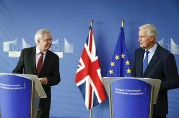 ??? 9月25日,在比利時首都布魯塞爾,歐盟首席談判代表巴尼耶(右)與英國“脫歐”事務(wù)大臣戴維·戴維斯出席記者會。歐盟與英國25日在布魯塞爾啟動第四輪“脫歐”談判,巴尼耶呼吁英方在“脫歐”談判中能更“清晰”。與以往三輪談判一樣,此輪談判為期4天,雙方繼續(xù)就公民權(quán)利、“‘脫歐’賬單”、北愛爾蘭邊界等議題進(jìn)行討價還價。記者 葉平凡 攝 |