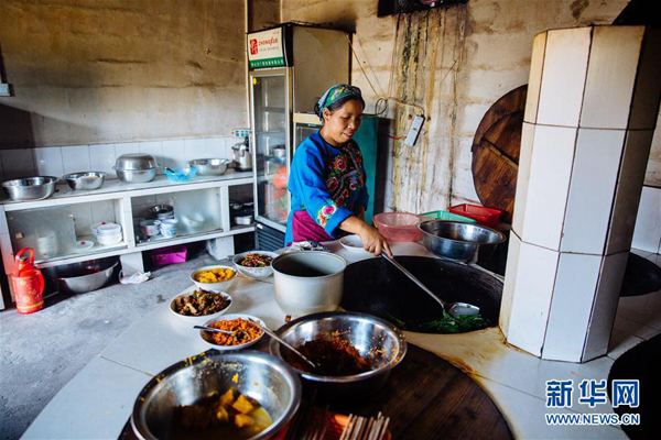 湖南湘西州花垣縣雙龍鎮(zhèn)十八洞村村民龍興花在自家的農(nóng)家樂為客人準(zhǔn)備飯菜(9月7日攝)。 新華社記者 朱煒 攝