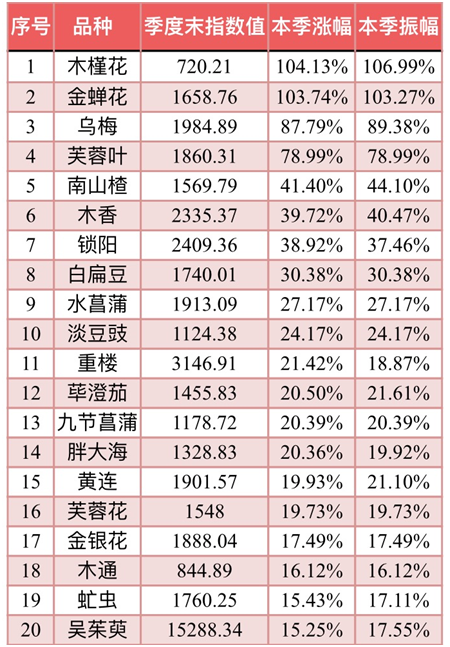 在監(jiān)測的中藥材品種中,動物類、花草類、野生類品種指數(shù)表現(xiàn)比較活躍。今年三季度,木槿花、金蟬花的指數(shù)漲幅均超過了100%,烏梅、芙蓉葉及南山楂的漲幅也超過了40%。報告指出,天氣異常導(dǎo)致采收困難、產(chǎn)量降低,庫存薄弱等,是推動這些指數(shù)上漲的重要因素。