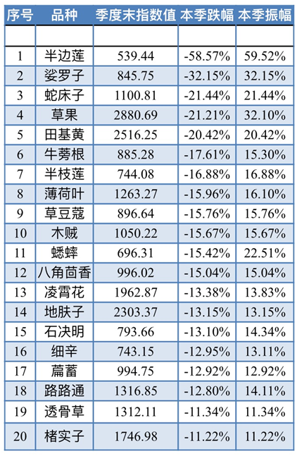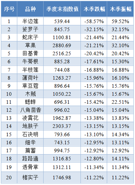 與上述藥材品種指數(shù)大幅上漲形成鮮明對比的是,半邊蓮指數(shù)大幅下跌58.57%,娑羅子指數(shù)下跌32.15%,蛇床子、草果和田基黃的下跌幅度超過20%。對此,報告分析認(rèn)為,與這些中藥材價格波動與種植環(huán)節(jié)存在不小關(guān)系。以娑羅子為例,該藥材于2015年達(dá)到歷史高價200元,這刺激了產(chǎn)地生產(chǎn)積極性,但也導(dǎo)致市場上供大于求,價格走入下跌通道,同時庫存須經(jīng)過長時間消化,短期內(nèi)娑羅子的價格仍將在低谷徘徊。