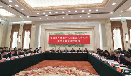 10月19日,十九大部分代表團(tuán)討論向中外記者開(kāi)放。這是中央金融系統(tǒng)代表團(tuán)在討論。新華社記者 陳建力/攝