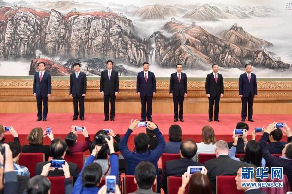 10月25日,剛剛在中共十九屆一中全會上當(dāng)選的中共中央總書記習(xí)近平和中央政治局常委李克強、栗戰(zhàn)書、汪洋、王滬寧、趙樂際、韓正在北京人民大會堂同采訪十九大的中外記者見面。新華社記者 馬占成 攝
