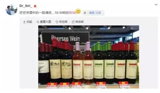 不久前,有位朋友在微博 po 圖稱在德國(guó)漢諾威的超市中偶遇張?jiān)F咸丫疲€配文:“茫茫洋酒中的一股清流”。