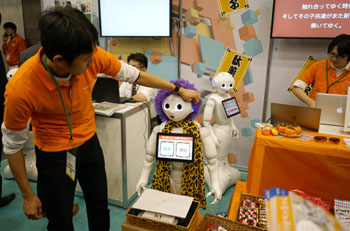 ??? 11月21日,在日本東京舉行的2017軟銀機器人世界大會上,一名工作人員為人型機器人Pepper戴上假發(fā)。當(dāng)日,為期兩天的2017軟銀機器人世界大會在東京開幕。新華社/歐新 |