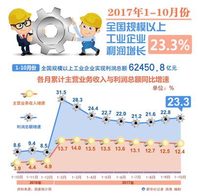 數(shù)據(jù)顯示,2017年1-10月份,規(guī)模以上工業(yè)企業(yè)利潤同比增長23.3%,增速比1-9月份加快0.5個百分點。其中,10月份利潤同比增長25.1%,增速雖比9月份減緩2.6個百分點,但仍是今年以來月度較高增速。