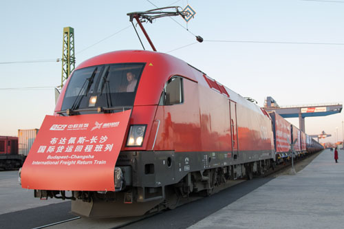 11月27日,布達佩斯至長沙國際貨運回程班列首發(fā)儀式在匈牙利首都布達佩斯舉行,這標志著布達佩斯至長沙的中歐班列回程線路正式開通。 新華社發(fā)(弗爾季·奧蒂洛 攝)