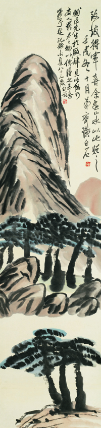 “澄道——近現(xiàn)代繪畫夜場(chǎng)”則甄選近現(xiàn)代名家杰作52件。吳昌碩1914年創(chuàng)作的《壽石天竺》,是以書法入畫的代表之作;陸儼少繪于1979的《竹桐清暑》可謂是集大成之作;黃賓虹創(chuàng)作于1947年《黃山連理松》可謂“丹青隱墨,墨隱丹青”,水墨與青綠相融合,營(yíng)造出了黃山氤氳朦朧的氛圍;張大千的《松陽滴翠》自題“擬巨然筆意”;《晚波魚艇》尺幅達(dá)到41.3平尺,并為李秋君上款;傅抱石的《雪夜訪友圖》創(chuàng)作時(shí),當(dāng)時(shí)重慶物資匱乏,此九尺巨制極為罕見,畫面左側(cè)中部鈐有“抱石得心之作”印章,為傅抱石金剛坡時(shí)期的巔峰之作;陳少梅繪于1945年的《西園雅集圖》,是其成熟期的人物畫代表巨作和明世之作。