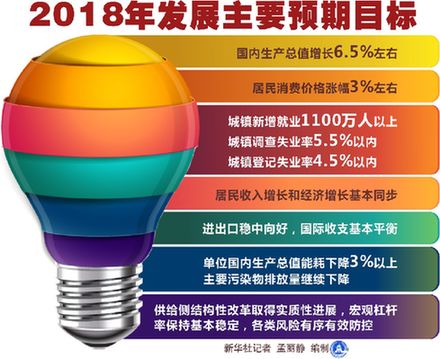 政府工作報(bào)告提出,今年發(fā)展主要預(yù)期目標(biāo)是:國內(nèi)生產(chǎn)總值增長6.5%左右;居民消費(fèi)價(jià)格漲幅3%左右;城鎮(zhèn)新增就業(yè)1100萬人以上,城鎮(zhèn)調(diào)查失業(yè)率5.5%以內(nèi),城鎮(zhèn)登記失業(yè)率4.5%以內(nèi);居民收入增長和經(jīng)濟(jì)增長基本同步;進(jìn)出口穩(wěn)中向好,國際收支基本平衡;單位國內(nèi)生產(chǎn)總值能耗下降3%以上,主要污染物排放量繼續(xù)下降;供給側(cè)結(jié)構(gòu)性改革取得實(shí)質(zhì)性進(jìn)展,宏觀杠桿率保持基本穩(wěn)定,各類風(fēng)險(xiǎn)有序有效防控。