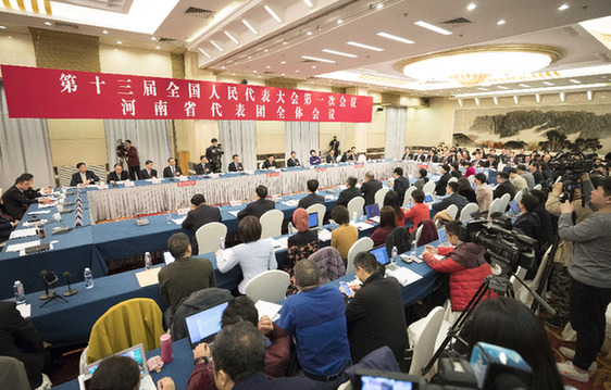 3月6日,十三屆全國(guó)人大一次會(huì)議河南代表團(tuán)全體會(huì)議向媒體開放。新華社記者 丁海濤 攝