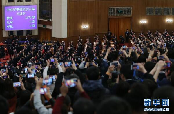 3月17日,十三屆全國人大一次會議在北京人民大會堂舉行第五次全體會議。習(xí)近平全票當(dāng)選為國家主席、中央軍委主席。 新華社記者 金立旺 攝