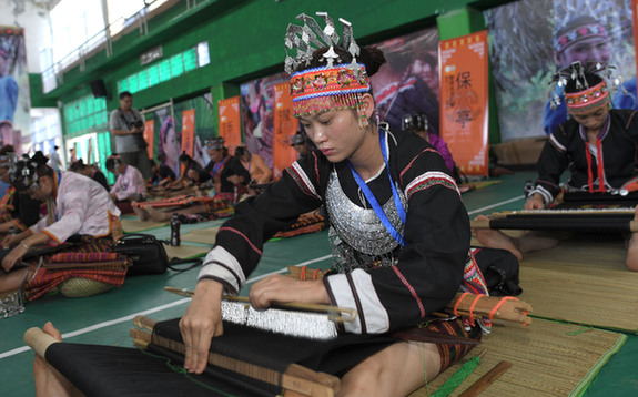 黎族婦女在進(jìn)行黎錦紡織比賽,歡慶“三月三”。記者 趙穎全 攝