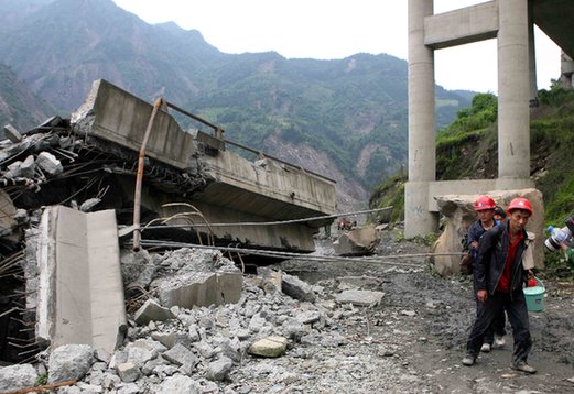 2008年5月14日,老百姓從倒塌的白花大橋旁走過。此次大地震中,震中地區(qū)汶川縣附近的道路受到嚴重破壞。記者 袁滿 攝