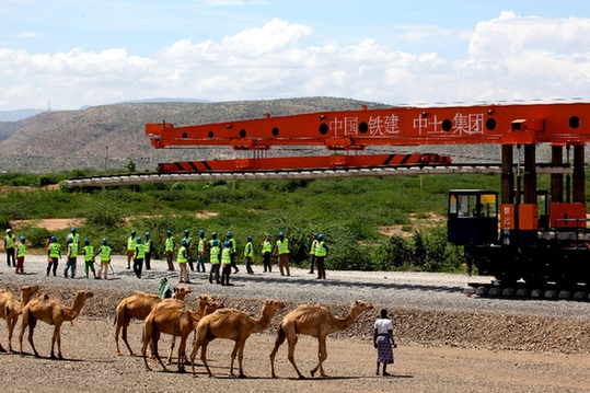 圖為2014年4月27日中國鐵建中土集團(tuán)的工人在埃塞俄比亞德雷達(dá)瓦進(jìn)行亞吉鐵路先期鋪軌作業(yè)的資料照片。新華社發(fā)(劉渝 攝)