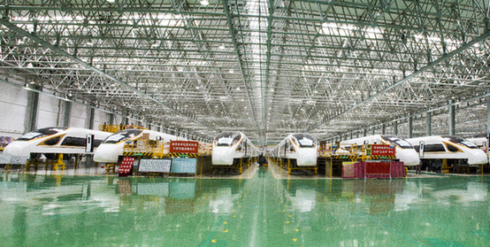 在中車長(zhǎng)客股份有限公司總裝車間,即將下線的“復(fù)興號(hào)”中國(guó)標(biāo)準(zhǔn)動(dòng)車組蔚為壯觀。(中車長(zhǎng)客供圖)