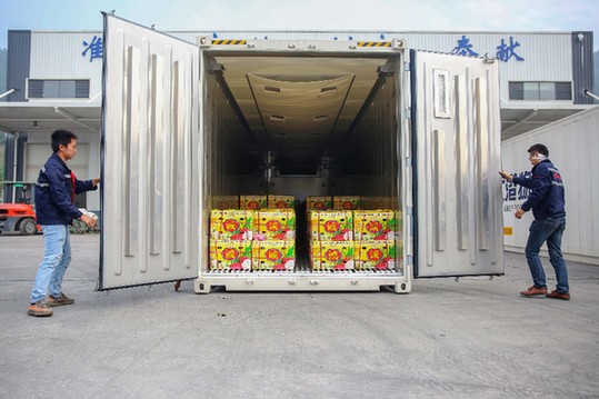 來自越南的火龍果搭乘中新互聯(lián)互通陸海新通道首個冷鏈專列抵渝。新華社發(fā)