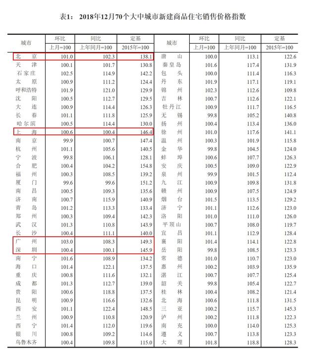 2018年12月份70個(gè)大中城市商品住宅銷售價(jià)格變動(dòng)情況。圖片來(lái)源:國(guó)家統(tǒng)計(jì)局網(wǎng)站