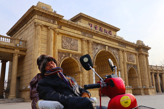 1月18日,在北京太陽城國際養(yǎng)老公寓大門前的廣場上,一位老人坐在代步車上曬太陽。記者 張小潔 攝