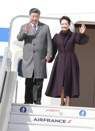 3月25日,國家主席習(xí)近平在巴黎愛麗舍宮同法國總統(tǒng)馬克龍會談。當(dāng)日上午,習(xí)近平結(jié)束在尼斯的行程,乘專機(jī)離開尼斯赴巴黎,繼續(xù)對法國進(jìn)行國事訪問。這是習(xí)近平和夫人彭麗媛抵達(dá)巴黎戴高樂機(jī)場。 新華社記者 丁林 攝